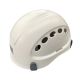 Capacete de segurança sem aba com fita jugular de 3 pontos e sistema de ajuste total para uso em trabalhos em ambientes dielétricos ou com riscos de respingo de produtos químicos ou incandescentes.