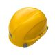 Capacete de segurança sem aba com fita jugular de 3 pontos e sistema de ajuste total para uso em trabalhos em ambientes dielétricos ou com riscos de respingo de produtos químicos ou incandescentes.